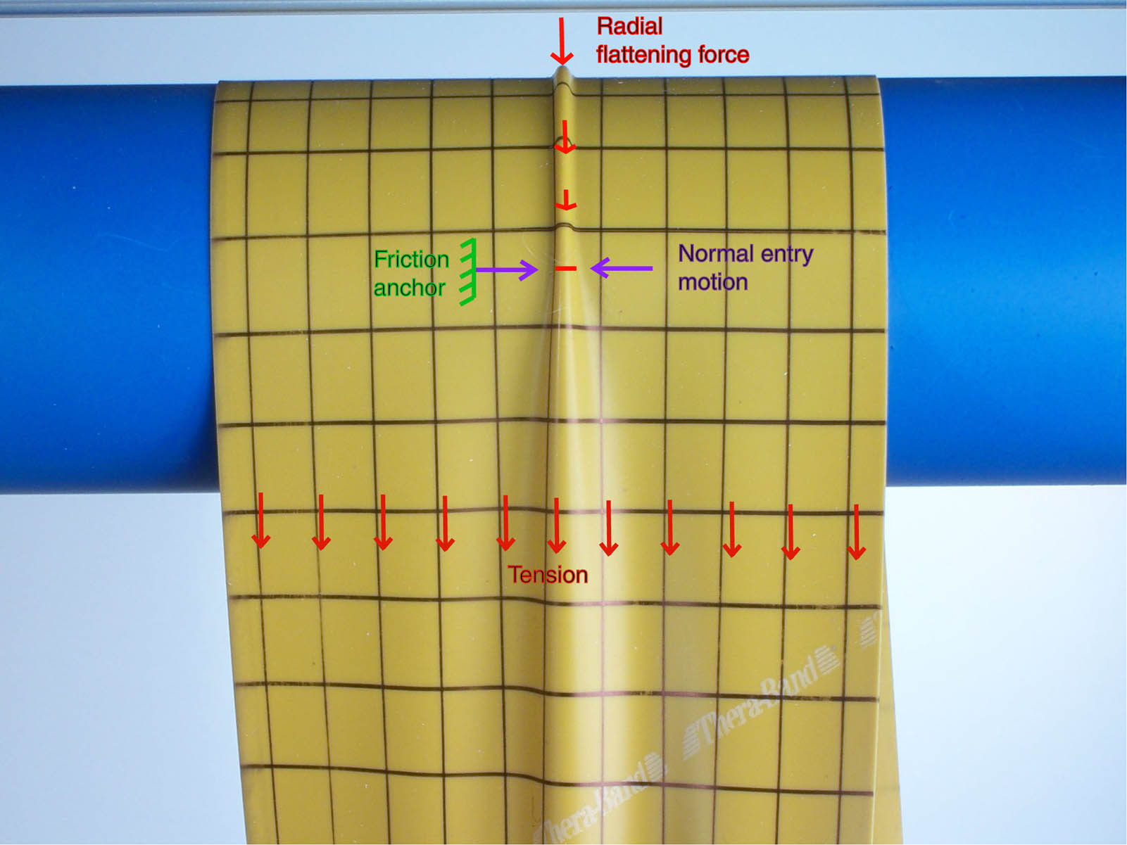 Taping Rollers for Traction and Spreading AIMCAL 2010 Powerpoint Paper Line operators commonly apply tape to rollers to spread the web. The most common technique is to put a band of masking tape underneath the web at each edge. A less common method is to use a lateral pattern consisting strips of different length in a chevron-like pattern extending from each roller edge into the web. In both cases, the idea is to approximate a concave profile (concave rollers spread the web). This paper focuses on the lateral taping method. A number of interesting measurements were made from which some tentative, but useful, conclusions can be drawn. |